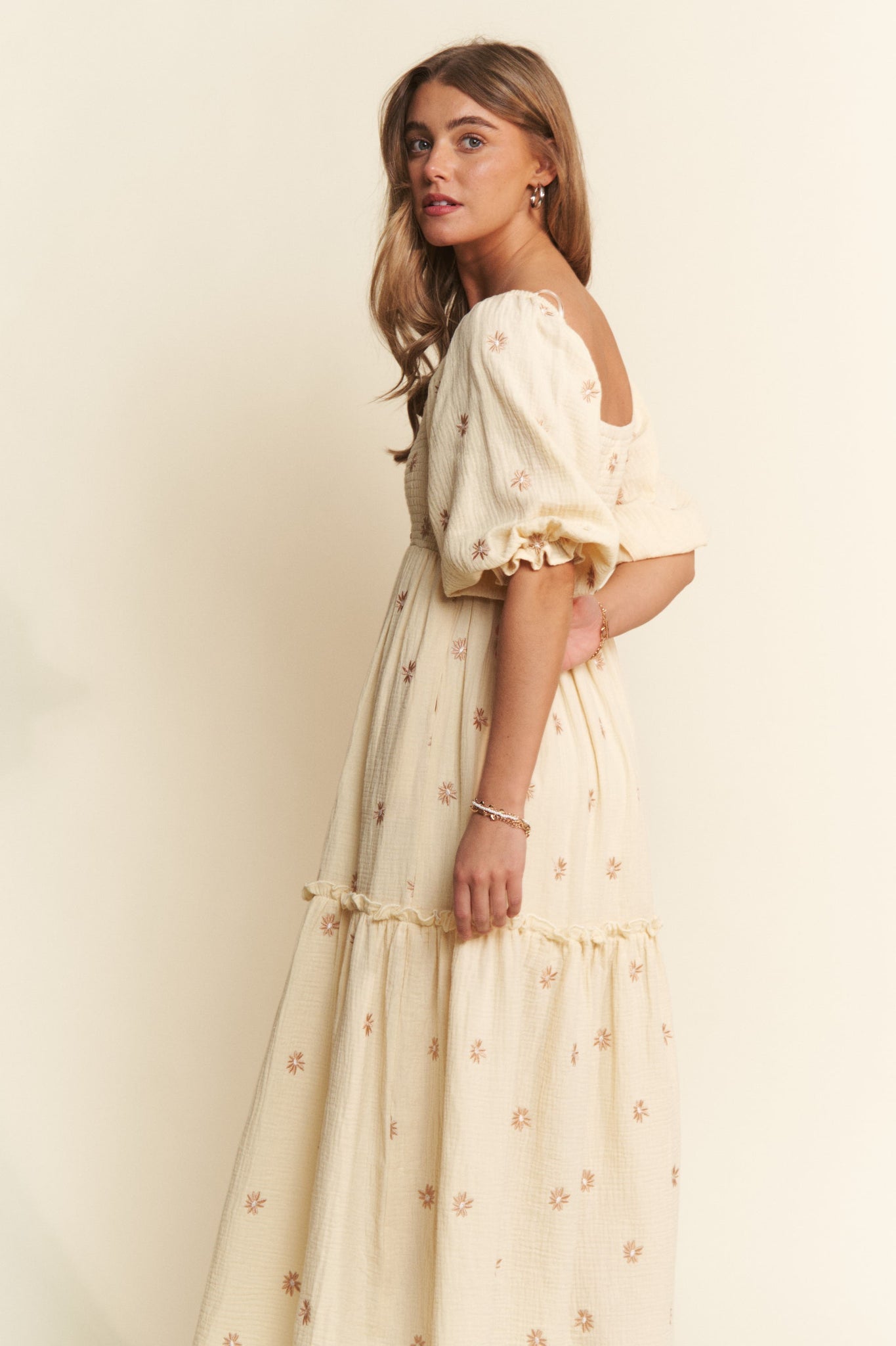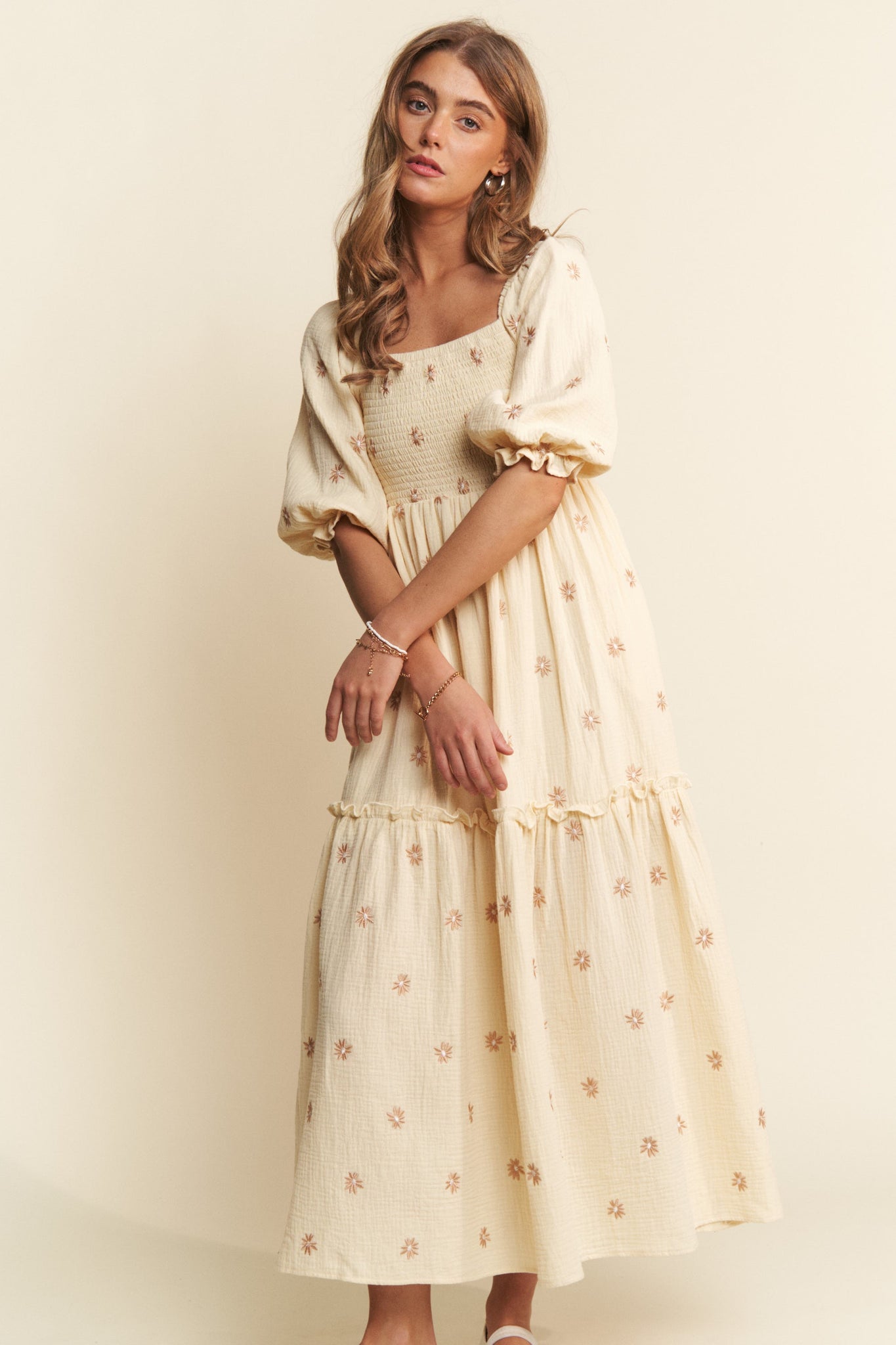 Women's floral embroidered smocked top tiered maxi dress. Half sleeve with a comfortable elastic ruffle cuff.