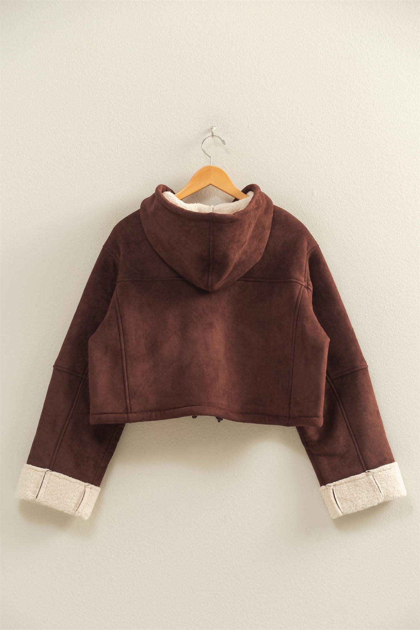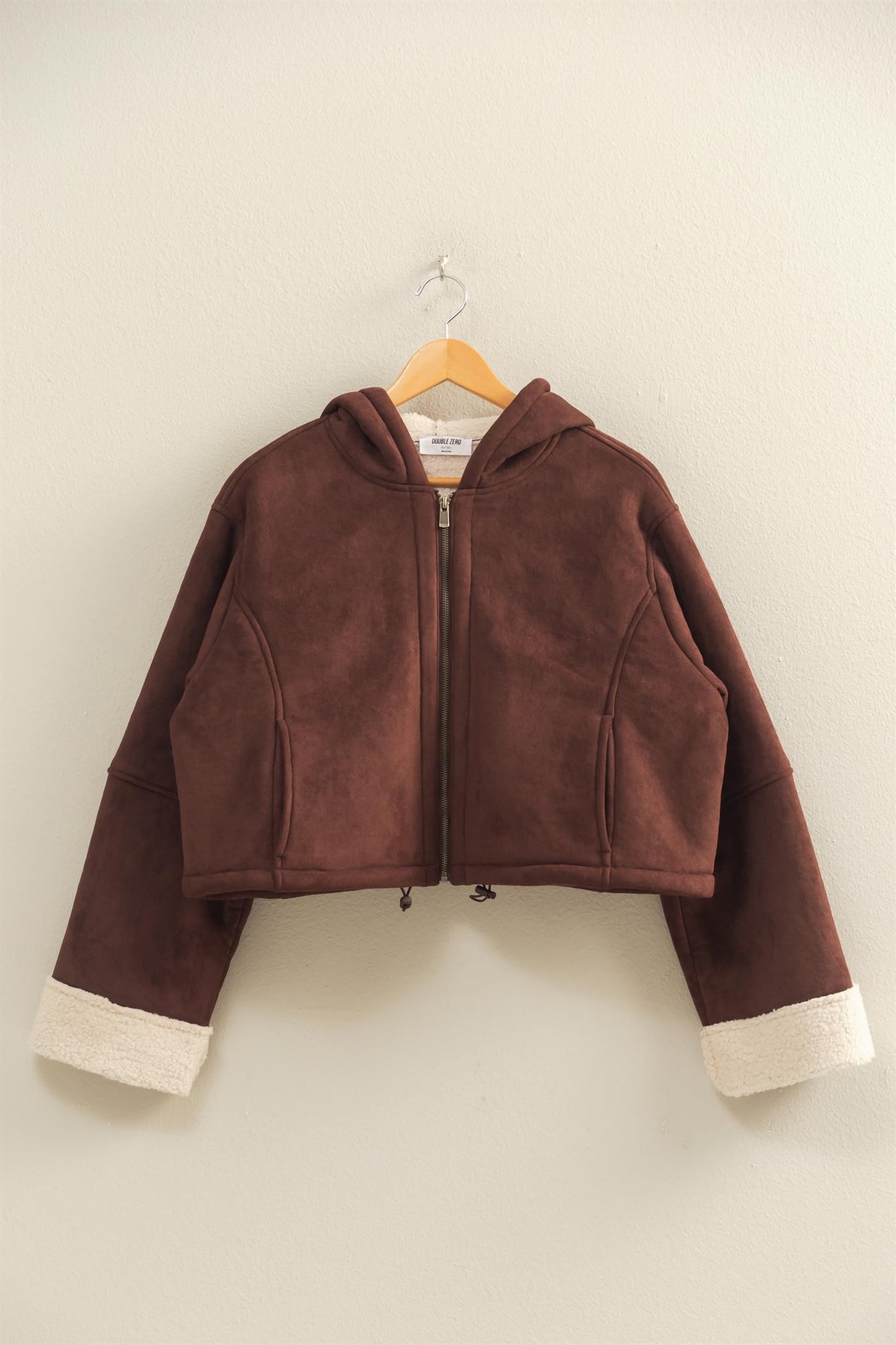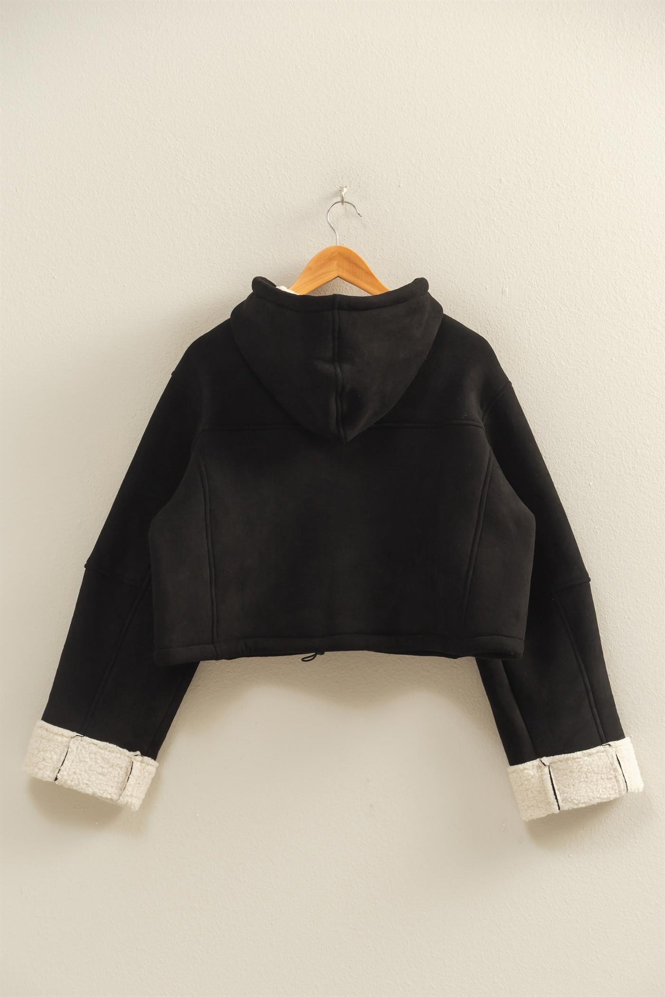 This outerwear piece features a zip-up front and hoodie, offering both versatility and comfort. Fashioned with soft Sherpa cuffs, it's perfect for crisp autumn evenings. Layer over a light turtleneck, pair with fitted jeans and boots for a refined, casual look. Ideal for transitioning seasons or a cozy night out.