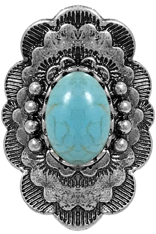 This high polish western concho style textured stretch ring has an oval shape and a turquoise gemstone.